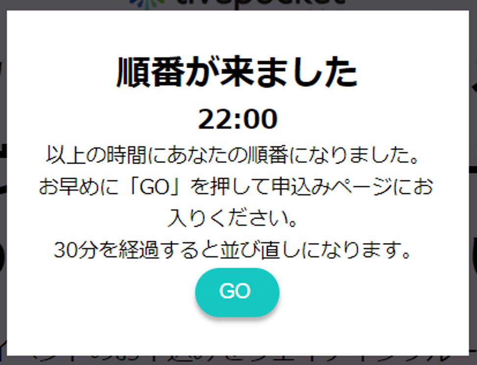・ご自身の順番が来た時間から30分間は、申込みページへのアクセスが有効です。30分を経過すると並び直しになります。